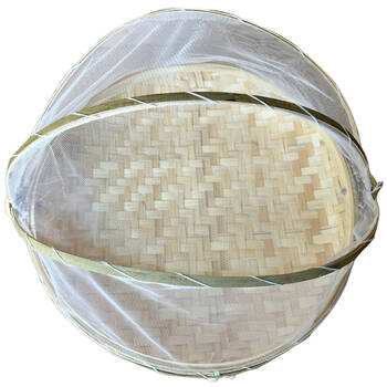 This food cover features a handwoven bamboo base and a collapsible fine mesh dome that allows air to circulate while keeping insects out. Its lightweight yet sturdy construction makes it easy to handle, lift, and store, providing a convenient solution for outdoor food presentation.
