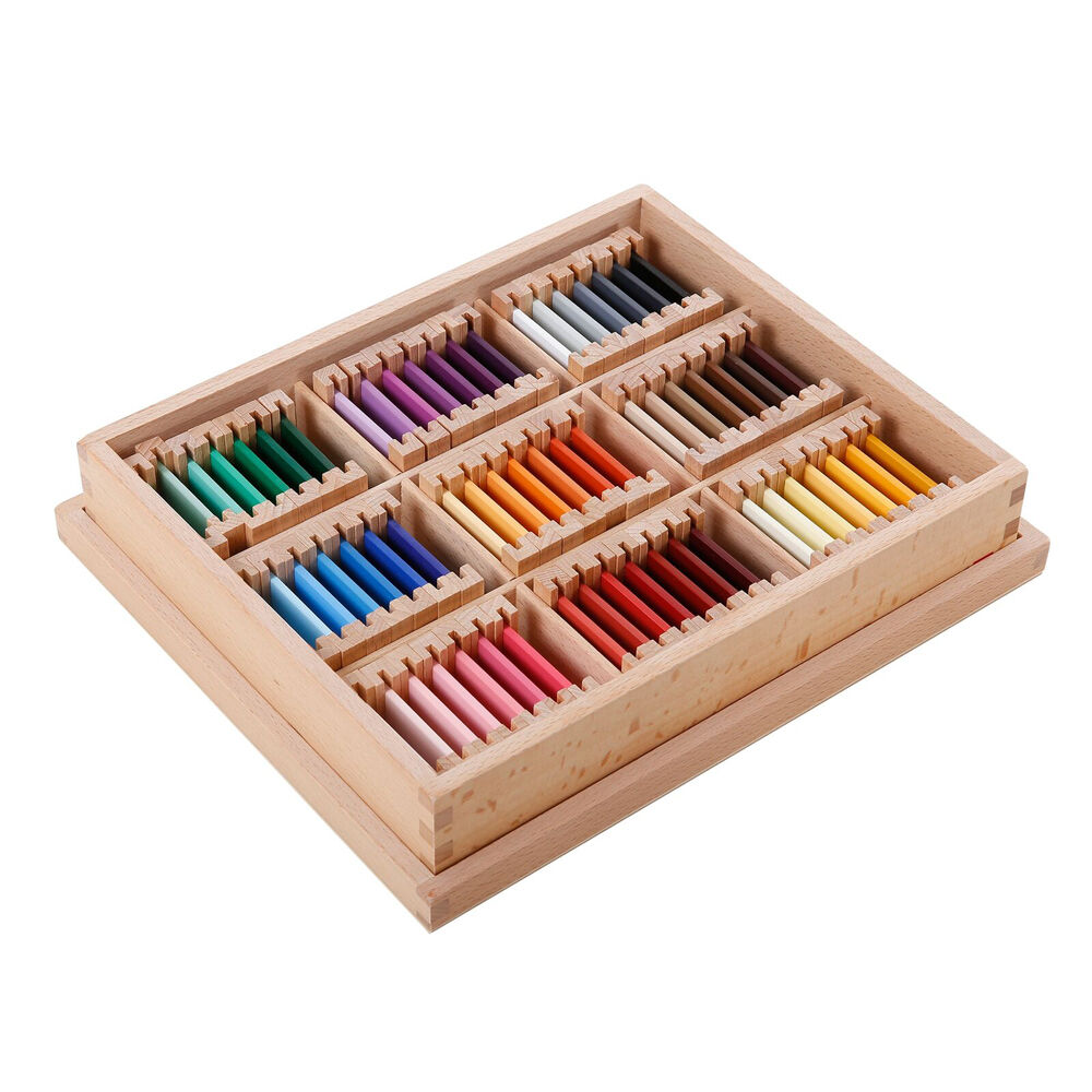 The Third Box of Color Tablets introduces the final stage in color discrimination—grading. It contains 63 wooden tablets representing nine colors, each available in seven graded shades: red, blue, yellow, green, purple, orange, brown, pink, and gray.
