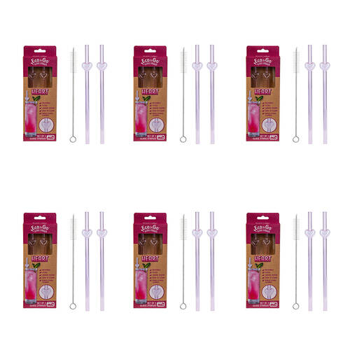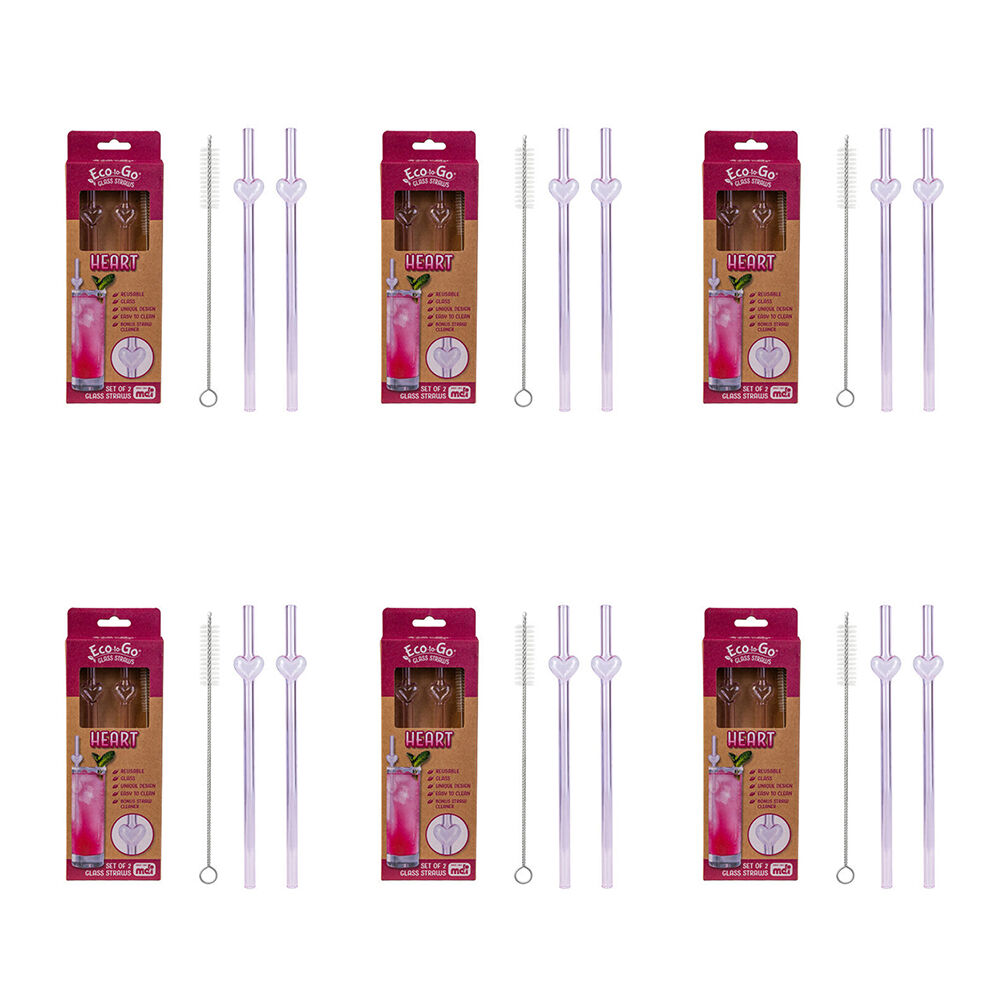 6x 2pc Eco-To-Go Glass Straw Heart Shaped Reusable with Cleaner Set