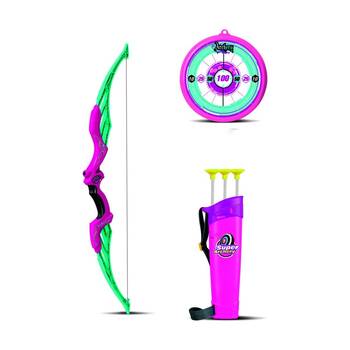 Introduce young children to the fun of target practice with this complete archery set designed specifically for girls. It includes a bow, three suction cup arrows, a shooting bucket, and an archery target, making it ideal for safe outdoor play and skill development.