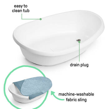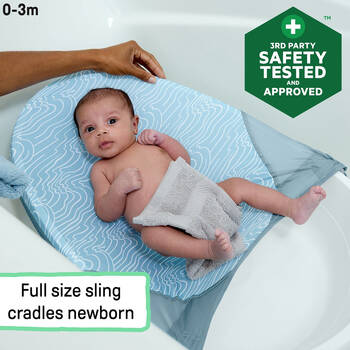 • Wide Sling Cradle: Fits across the tub to safely and comfortably support baby during first baths.