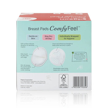 50pc Pigeon Comfy Feel Breast Pads Stay dry and in control with Pigeon Comfyfeel Disposable Breast Pads. Designed for all day comfort, its ultra-soft pad reduces the likelihood of nipple abrasion. It is also lined with aloe vera extract for added moisturization. The breast pads stay firmly im place with improved adhesives and fit discreetly under clothing. Made from a super absorbent polymer material, it is also breathable and leak-proof. Now breast milk leakage remains in the pads not on your clothing. Features Lined with aloe vera extract to improve skin moisture Slim design fits comfortably & discreetly Super absorbent Breathable outer lining keeps skin cool & dry Dermatologically tested Individually wrapped for hygiene Includes: 3 x 50pc Breast Pads