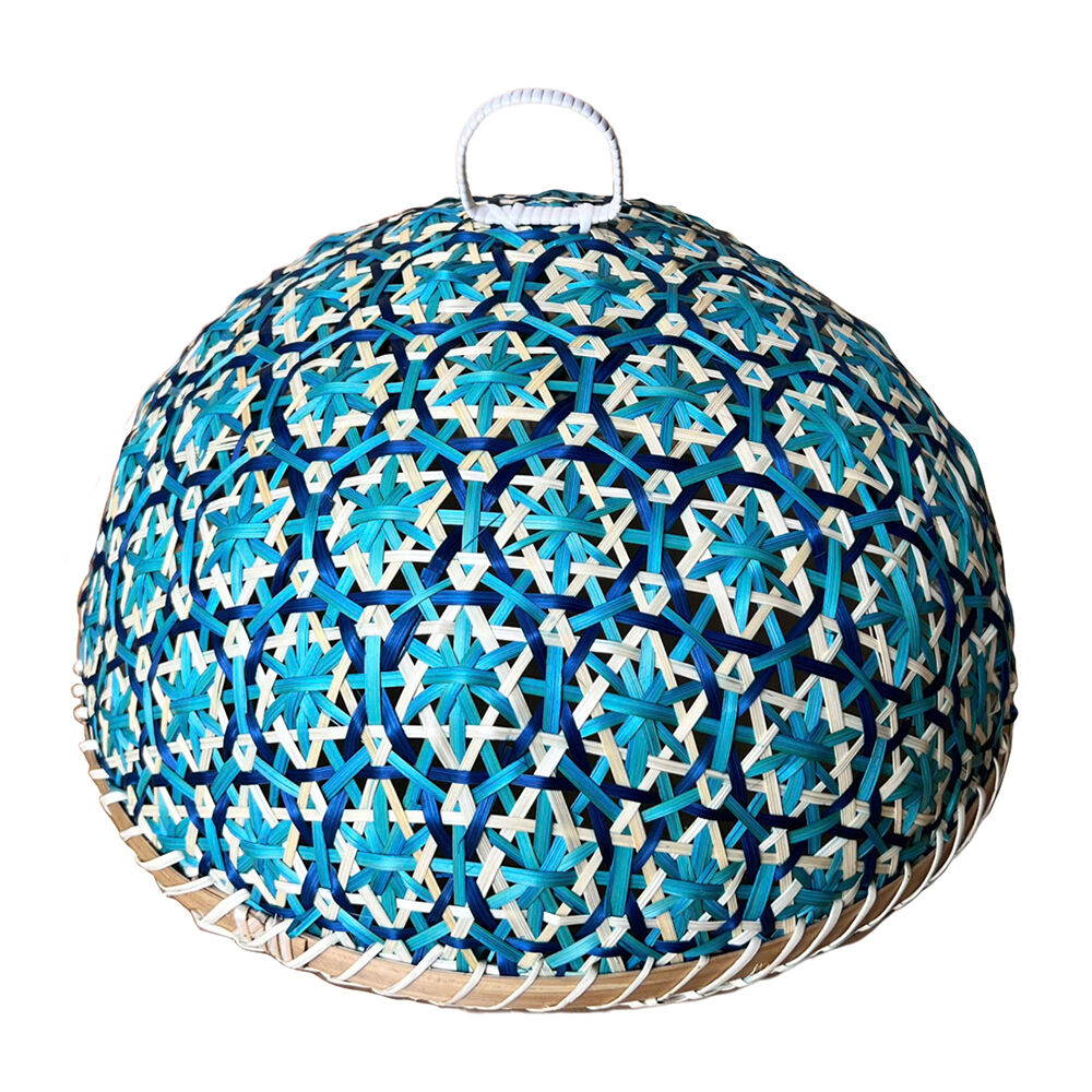 Add charm and function to your table with this handcrafted bamboo food cover. Designed in a domed shape with an intricate star-pattern weave, each cover offers breathable protection while showcasing unique character. Keep your food fresh and stylishly protected with this handwoven bamboo food cover. Featuring an intricate star-pattern weave in natural and navy tones, it adds a touch of artisanal charm to outdoor picnics, grazing tables, or kitchen counters. Lightweight, breathable, and functional, it is a beautiful way to keep pesky bugs at bay while elevating your presentation.