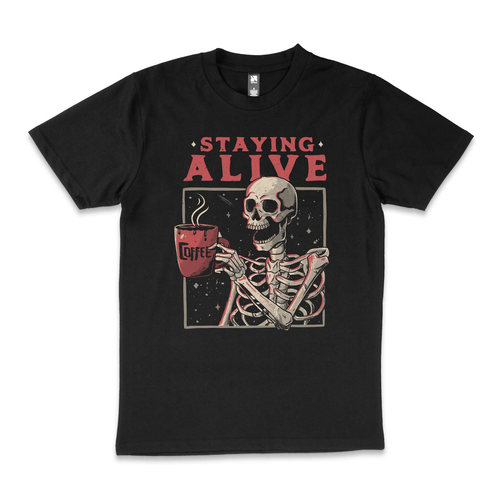 Staying Alive Funny Skeleton Coffee Cotton T-Shirt Black Size 2XL