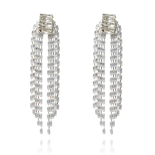 Too glam not to make a statement. Introducing Aries Arch String Statement Earrings - a bold and chic ear statement adding a high fashion element to your styling. This design features clouded diamante strings forming a waterfall on either side of a stack of four larger rectangular rhinestones at the top. The earrings are made in environmentally friendly alloy with silver plating. Perfect for modern, retro, high fashion, glamour, fashion event, runway styling, bold, chic, smart casual styles and more.