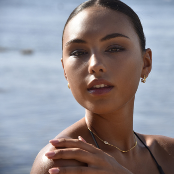 This necklace is 45cm long. Please kindly note that the position of the necklace sitting on your neck can vary from individual to individual depending on your top size. Model is a size 8.