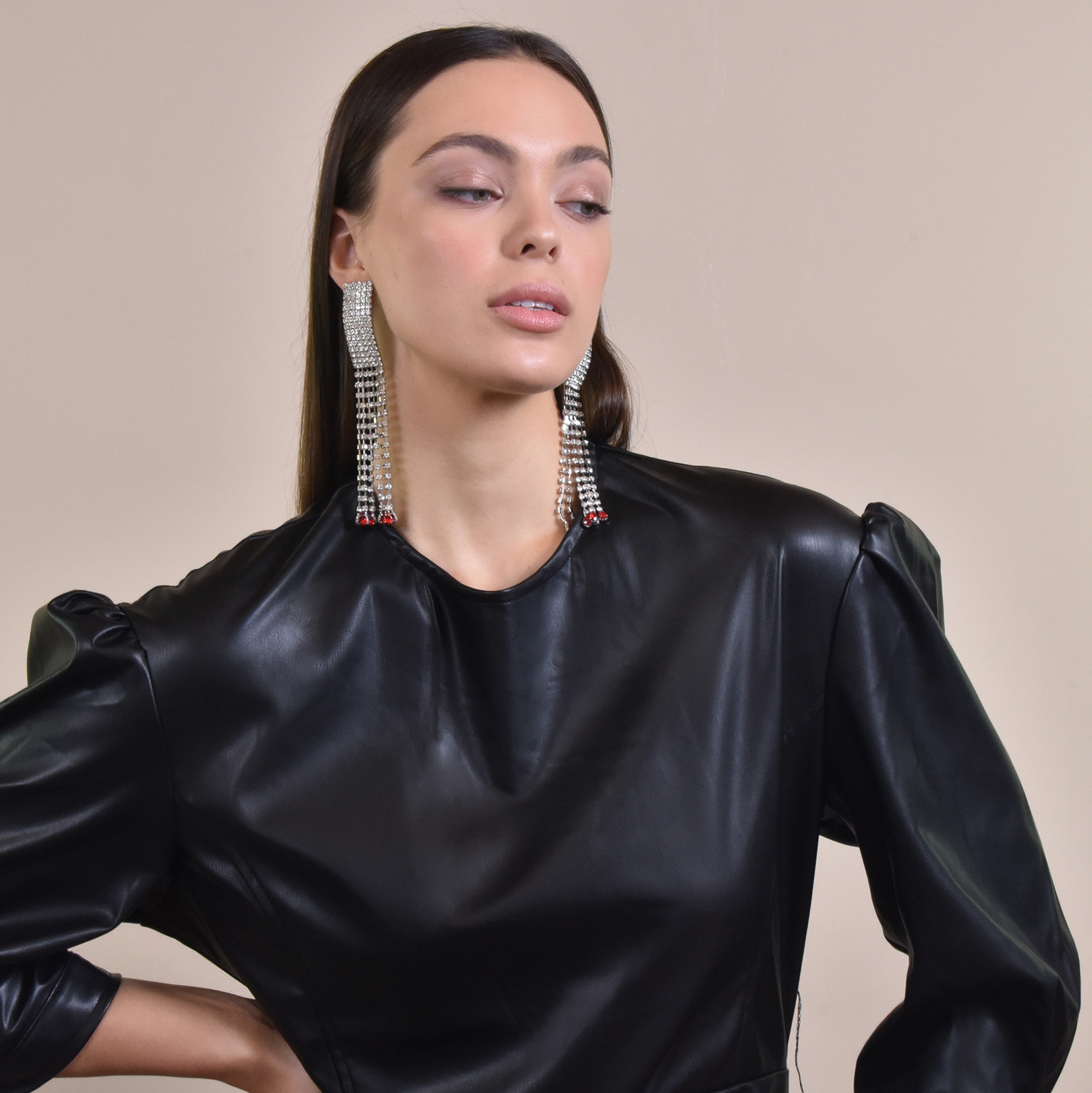 a runway style oversized diamante design for expressive muses. This design features a slightly convex rectangular header atop 6 strings of clear diamantes with a ruby crystal diamante at the tips, adding a sparkle of red that is tasteful yet not overwhelming. Crafted in environmentally friendly stainless steel (nickel free) with silver plating, this earring style will definitely turn heads and leave a lasting impression. Perfect for formal, semi-formal, runway, fashion events, creative styling, magazine, high fashion and dressy occasions. Hypoallergenic, nickel, cadmium and lead free.