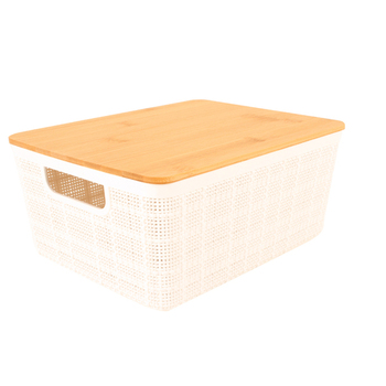 This Home Expression plastic storage basket is a great way to organize your home. It features a white plastic body with a bamboo lid and measures 24 x 19 x 11cm. It is perfect for storing items such as toys, books, clothes, and more.