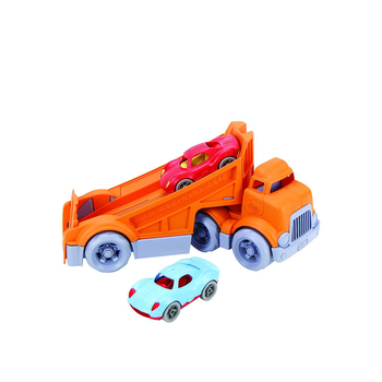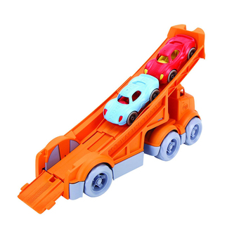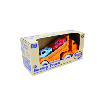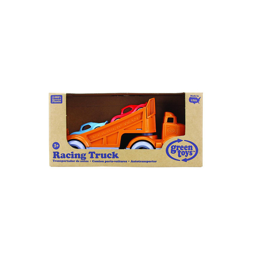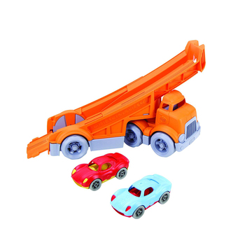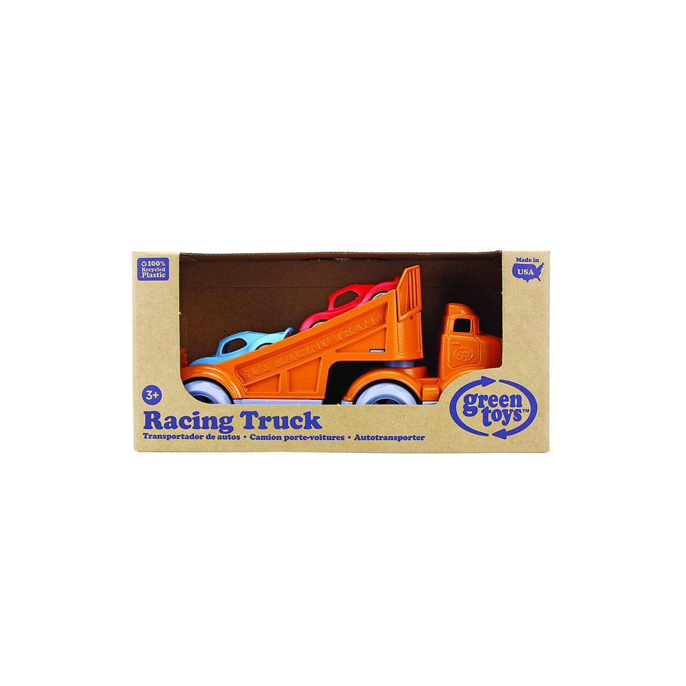 It’s off to the races with the Green Toys Racing Truck! The 3 piece set includes a bright orange Racing Truck and 2 Stack & Link Racers. The pocket-sized racers are the perfect size babies and toddlers, but are filled with fun for any age. The unique design allows for the cars to be used individually, stacked together, or linked in a chain. Each car also sports unique texture detailing for tactile stimulation. Hook the racers to the back of the Racing Truck’s extendable ramp, and when ready, release the car (or cars!) to zoom down! With no metal axels or small parts, the set is great for both indoor and outdoor play, and encourages motor skill development and imaginative, creative play.