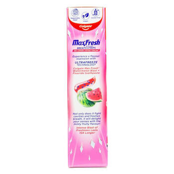 Experience flavour that wakes you with Colgate Max Fresh Watermelon Blast + Fluoride toothpaste with mini breath strips.