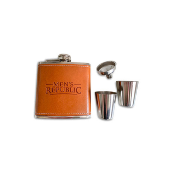This Men's Republic 6oz or 170ml Whisky and Spirits Hip Flask is bound in a branded tan leatherette, fitted with a captive screw-on lid to help prevent loss or leakage.