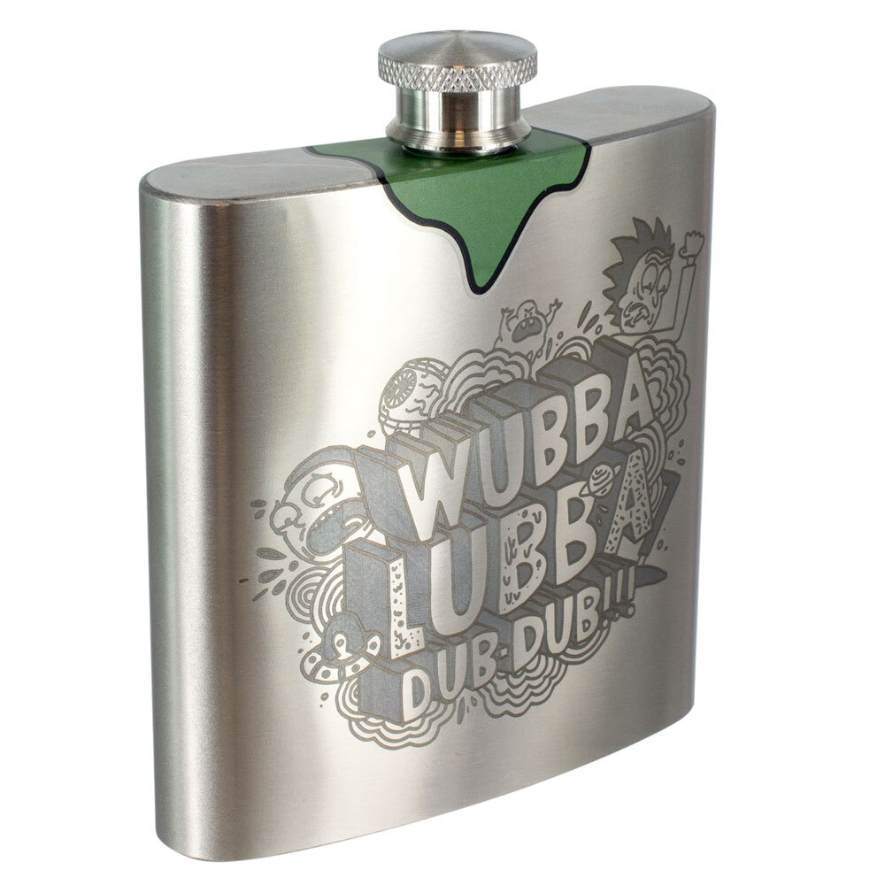 Stay hydrated on your next action packed, alien filled adventure with Rick's hip flask - the perfect way to enjoy a drink whilst on the go. This 6oz metal hip flask With screw cap has one Of Rick's favourite catch phrases - 'Wubba Lubba dub dub' - etched onto one side And A note reading 'if found, return full to Rick Sanchez, Dimension c-137' On the other.