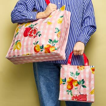 A splash of juicy citrus fruit refreshes your travels with the Positano tote bags. Vibrant illustrations of lemons, oranges and pomegranates sit atop a sweet pink, check-patterned background. These tote bags, available in small and large, are made of 100% cotton with a PVC coating for durability and structure.