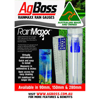 Highly accurate rain gauge ideal for primary producers, graziers and keen weather watchers. The AgBoss RainMaxx rain gauges don’t discolour in the sun like other brands, they stay easy to read for years. Features