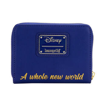 Fly away to a whole new world with this Loungefly Disney Aladdin 30th Anniversary Zip Around Wallet. On the front, Aladdin and Jasmine soar through a brilliant night sky, brought to life with silver metallic stars. The moon appears in the background as Aladdin and Jasmine, in debossed detail, embrace each other on a magic carpet ride. On the back, gold metallic debossed words read "A whole new world." On the inside, there are 4 slots for holding cards and a clear slot for holding your ID. The clear ID holder features a die-cut of the 30th anniversary 8-point star logo. It's the perfect accessory for pairing with a Disney outfit or transforming everyday outings into magical adventures.