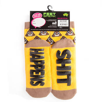 Appreciate life's misfortunes with these golden Smiling Poo Feet Speak Socks that feature an adorable pattern of smiling poo emojis. Let your socks speak for you by showing the punny soles that say "Sh** Happens" in a bold black print - get through the crappiest of days by smiling like these little poos! These Feet Speak Socks aren't just stylish and comfortable, but even have anti-slip soles to prevent any accidents from happening on smooth floors. One size fits most.