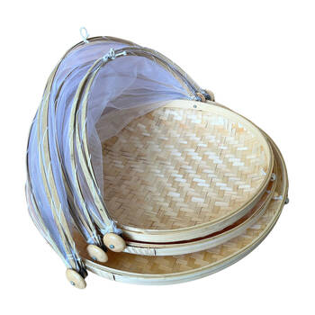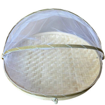 This food cover features a handwoven bamboo base and a collapsible fine mesh dome that allows air to circulate while keeping insects out. Its lightweight yet sturdy construction makes it easy to handle, lift, and store, providing a convenient solution for outdoor food presentation.