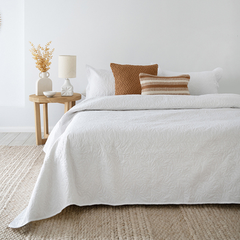 Bambury's Embossed Coverlet Sets are a very popular alternative for dressing your bed, instead of using a heavy quilt cover. These printed or plain Coverlet Sets are machine washable and include two pillowcases. They feature a quilted texture on the surface which is made by embossing intricate patterns onto the surface fabric, with a lightweight fill in between the front and reverse sides. The Botanica design features a beautiful tranquil leaf pattern and comes in a variety of colours.