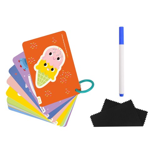 Learn to trace, colour, recognise shapes and follow instructions with this travel trace set. Featuring 60 activities and desgns, this set is held together with a plastric ring, so you can flip through the activities and choose the designs you like best. This set also comes with a wipe down pen and is perfect for small activities at home or on the go travel. There are so many ways to learn with these dot-to-dot cards held together with a plastic ring, the easy to clean surface keeps the cards looking new. Comes with a wipe clean pen so kids can complete it again and again, providing endless fun!