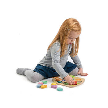 This adorable puzzle features a squirrel and his acorns. Each acorn is coloured and numbered so children can match them to the coloured dots on the wooden board. Product Dimensions: Includes: